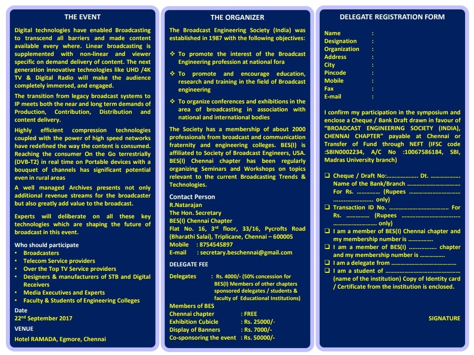 BES Chennai chapter is organizing one-day Annual Mid Term Symposium on "BROADCASTING – CONNECTING ALWAYS BY ALL WAYS "on 22 -09-2017 at Hotel Ramada, Egmore, Chennai. This seminar is mainly focused on the next generation innovative technologies like UHD /4K TV & Digital Radio.